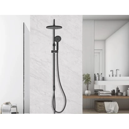 Das Aurlane Hand- und Kopfbrause-Set Black Moments ist mit einer höhenverstellbaren Brausestange (Länge 72,5 cm) ausgestattet. Eine Kopfbrause und eine Handbrause mit 3 Strahlarten runden das System ab. Per Knopfdruck lässt sich leicht zwischen Kopf- und Handbrause wechseln. Das System ist in elegantem Schwarz matt gehalten.