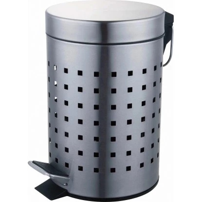 Der Treteimer aus Edelstahl hat eine Chrom matte Oberfläche mit Lochdesign und ist durch das Pedal bequem zu bedienen. Er ist 26 cm hoch und hat ein Fassungsvermögen von 3 l.
