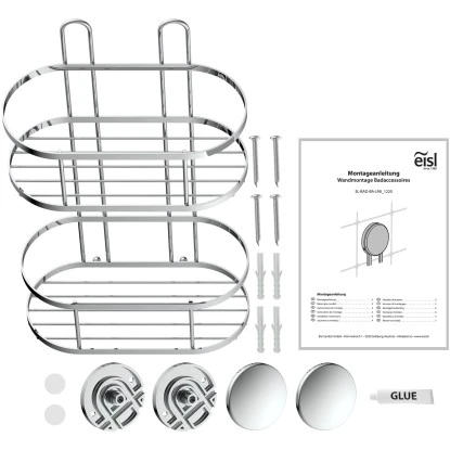 Komplett Set: 1 x Duschkorb Wand mit 2 Etagen (B x H x T: 220 x 355 x 116 mm), 2 x Wandhalterung mit je einem Klebepad, 1 x Tube Kleber, 4 x Schrauben, 4 x Dübel, Montageanleitung
