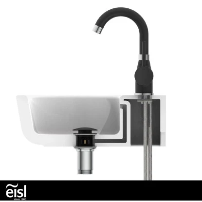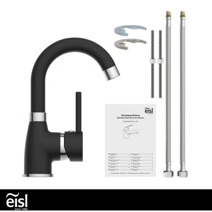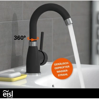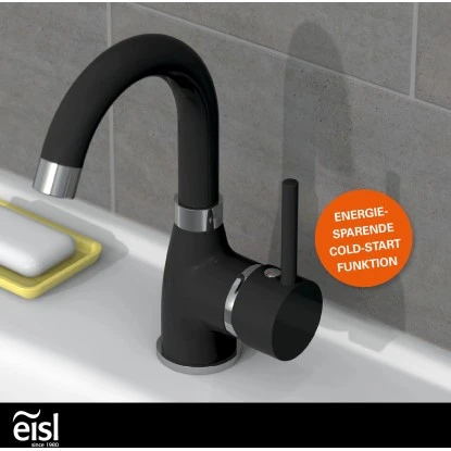Eisl Waschtischarmatur Futura Schwarz-Chrom. Ressourcenschonend handeln auch im Kleinen? Dann ist diese Einhebel-Mischbatterie mit Cold-Start Technik genau richtig, denn sie gewährt bei senkrechter Position des Bedienhebels nur den Zufluss von Kaltwasser. Bei vielen Waschgängen völlig ausreichend.
