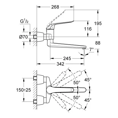 Der Bedienungshebel ist aus Metall und die Ausladung misst 34,2 cm. Die Waschbeckenarmatur ist für die Wandmontage geeignet und besitzt absperrbare S-Anschlüsse.