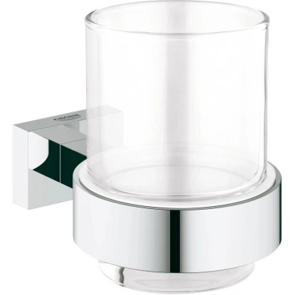 Das Glas mit Halter gehört zu der Serie Essentials Cube. Es besteht aus Glas und der Halter aus Metall. Zudem hat es eine verdeckte Befestigung und hat eine GROHE StarLight Chromoberfläche.