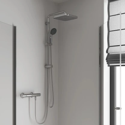 Das Grohe QuickFix Duschsystem Vitalio Start 250 Cube verbindet Stil, Eleganz und Vielseitigkeit. Mit einem modernen, schlanken Profil und verbessertem Komfort sorgt es für ein unvergleichliches Duscherlebnis. Das Duschsystem ist für die Wandmontage konzipiert und für Durchlauferhitzer ab 18 kWh geeignet.