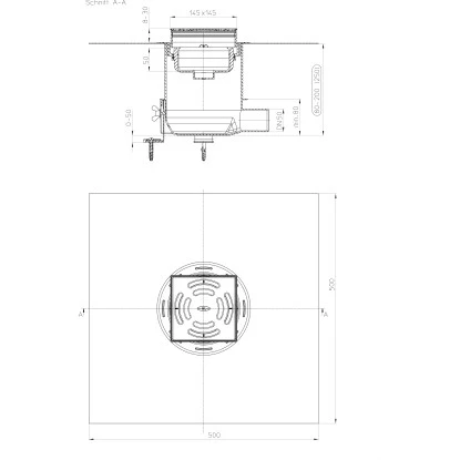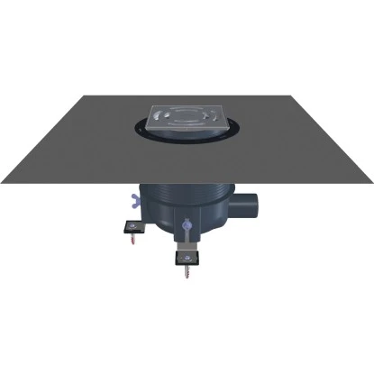 Duschablauf mit 3 Befestigungswinkeln, die am Boden befestigt werden und in der Höhe verstellt werden können. Das Ablaufgehäuse muss in der Verlegephase nicht genau an die Estrichoberkante angepasst werden. Der herausstehende Ablaufteil wird estrichbündig abgesägt. Nach Montage der Abdichtgarnitur wird der Aufsatz auf die Fliesenhöhe angepasst.