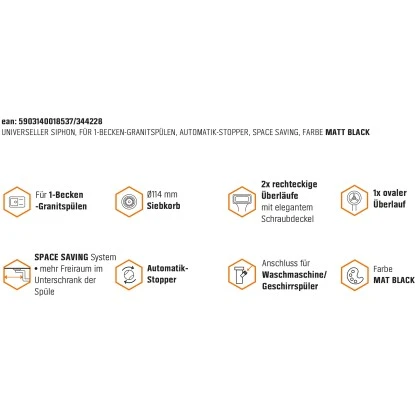 Mit dem komfortablen universellen Röhrensiphon-Set von Miló kann ein Spültisch mit dem Abwassersystem der Küche verbunden werden. Direkt integriert ist eine automatische Ab- und Überlaufgarnitur für ein Einzelbecken. Sie ist mit einem Exzenter ausgestattet, der eine externe Bedienung über einen Bowdenzug ermöglicht. Siebkorb und Exzenter sind in der Farbe Mattschwarz ausgeführt, für eine moderne Küchengestaltung. Das Röhrensystem ist so geleitet, dass es einen zuverlässigen Geruchs- und Gasstopp bietet. Gleichzeitig lassen sich die einzelnen Elemente bei Bedarf aufschrauben. Dank der platzsparenden Ausführung passt der Siphon auch in kleine Unterschränke. Der Ab- und Überlauf ist aus hochwertigem Edelstahl gefertigt. Das Material zeichnet sich durch seine langlebigen und rostfreien Eigenschaften aus. Die Rohre sind aus Plastik hergestellt. Der Abschlussrohrdurchmesser beträgt 114 mm. Für den Anschluss eines Geschirrspülers ist bereits ein Schlauchstutzen integriert. Der Lieferumfang umfasst den Röhrensiphon, die Ab- und Überlaufgarnitur mit Siebkorb sowie einen Exzenter mit Bowdenzug.