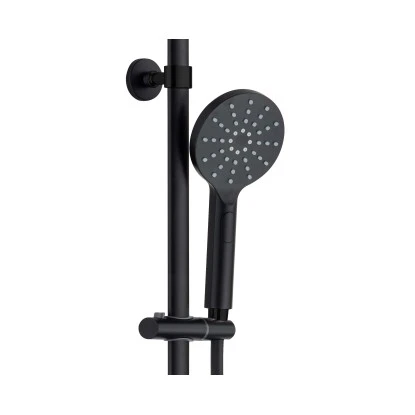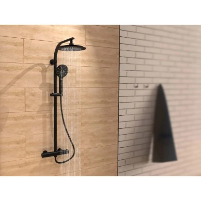 Das elegante schütte Duschsystem Madura Fresh mit Thermostatarmatur besteht aus hochwertiger Edelstahl-Duschsäule in der trendstarken Optik Schwarz Matt und Kunststoff-Brauseschlauch mit Standard 1/2 Zoll Anschluss. Die großformatige, sehr flache Edelstahl-Kopfbrause und moderne Handbrause mit drei Strahlvarianten(Spray, Massage, Kombistrahl) sorgen für pures Duschvergnügen. Die vorhandene Thermostatarmatur sorgt für einen gleichmäßigen Temperaturfluss und die Sicherheitssperre bei 38°C minimiert das Risiko vor Verbrühungen. Gewechselt wird bequem mit dem integrierten Umsteller. Die Antikalk-Noppen an den Brauseköpfen sorgen für die einfache Entfernung von Kalkrückständenund machen das Reinigen zum Kinderspiel. Dank separater Wasserspardichtung ist bis zu 50% Wasserersparnis möglich. Variable Wandhalterung kann für vorhandener Bohrlöcher genutzt werden.
