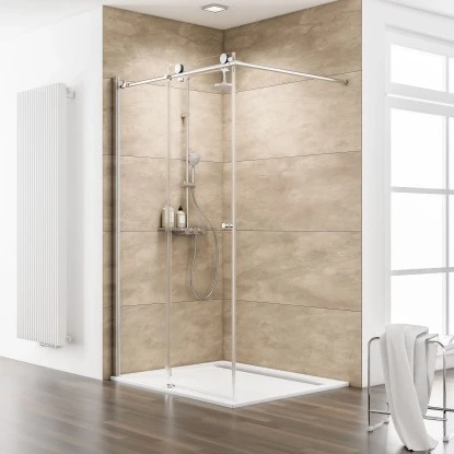 Die Duschwand Walk In mit Schiebetür und Festelement, der Serie MasterClass von Schulte, verfolgt einen eleganten Look, der von einer dezenten Rahmung sowie einer formschönen Laufschiene bestimmt wird.