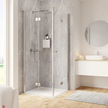 Die Schulte ExpressPlus Drehfalttür Eckeinstieg Garant 2.0 Chromoptik hat eine Größe von 200 cm x 100 cm x 100 cm und setzt sich aus insgesamt vier 6 mm starken Sicherheitsglas-Elementen (ESG) zusammen. Die beiden Türelemente öffnen über zwei formschöne Griffe über Eck und bieten somit einen großzügigen Einstiegsbereich. Die raumsparende Tür lässt sich einfach zusammenfalten, sodass auch im geöffneten Zustand kein Element in den Raum hineinragt. Dies macht die Drehfalttür zur optimalen Lösung für kleine Bäder. Die eleganten Profile und Anbauteile setzen die Duschtüre zudem optimal in Szene und halten sie sicher in Position.