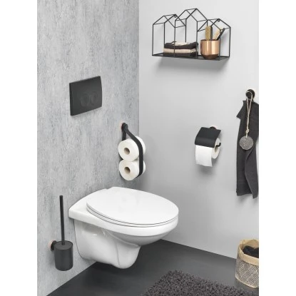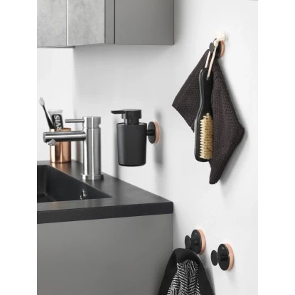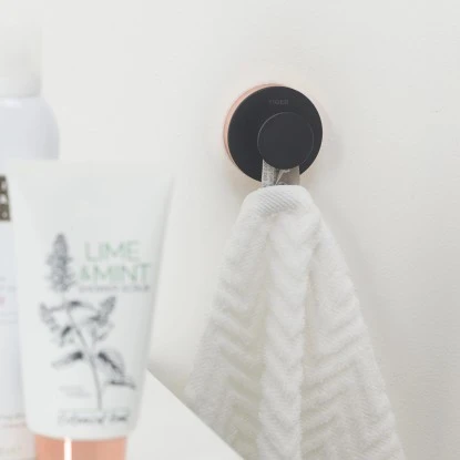 Die Serie Urban in trendigem Schwarz bietet modernes, industrielles Design. Individuellen Touch verleihen Sie den Accessoires mit den beigefügten Dekor-Ringen in Dunkelgrau oder Kupfer. Die Artikel lassen sich einfach mittels der mitgelieferten Edelstahl-Schrauben und Dübel an der Wand befestigen. Alternativ können Sie die Accessoires auch ohne zu Bohren mit dem separat erhältlichen Tigerfix-Befestigungsset Nr. 1 kleben. Der formschöne Haken fügt sich stilvoll in jedes Bad ein.