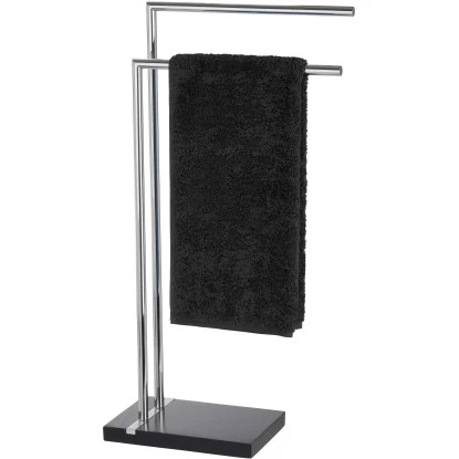 Die Bad-Accessoires Serie Noble Black zeichnet sich durch ihre Eleganz mit klaren Linien aus. Alle Accessoires sind aus hochwertigem Polyresin mit Chrom-Applikation gefertigt. Der schwarze Handtuch- und Kleiderständer fügt sich stilvoll in das Bade- oder Schlafzimmer-Ambiente ein. Er bietet zusätzliche Aufhängemöglichkeiten und mit zwei Armen viel Platz für Hand-, Dusch- und Badetücher oder Kleidungsstücke. Der schöne Standfuß sorgt für sicheren Halt.
