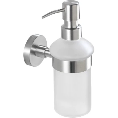 Der hochwertige Seifenspender aus der Bad-Accessoire Serie Bosio bringt stilvolle Eleganz in jedes Bad und vereint Funktionalität und Qualität. Er besteht aus einer Halterung aus hochwertigem, rostfreiem Edelstahl und einem abnehmbaren, satiniertem Glasspender.
