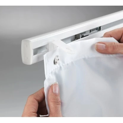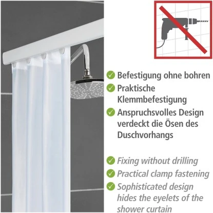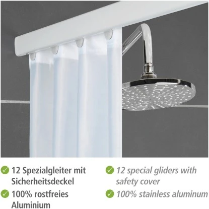 Wenko bietet eine clevere Alternative zur Duschstange: Die hochwertige Wenko Teleskop-Duschschiene Era Weiß eignet sich ideal für die Dusche und ist individuell ausziehbar von 75 cm bis 125 cm. Dabei macht das in Weiß gehaltene Aluminium der Duschvorhang-Schiene eine gute Figur im Badezimmer und ist darüber hinaus zu 100 % rostfrei, also ideal für den Nassbereich. Dank der praktischen Klemmbefestigung lassen sich die Schienen ganz ohne bohren anbringen. Die 12 innovativen Spezialgleiter mit Sicherheitsdeckel sind inklusive und bieten eine sichere und dauerhafte Befestigung für alle Duschvorhänge unabhängig vom Material und vom Durchmesser der Öse. Die Haken gleiten dabei sanft in den Schienen und der Duschvorhang lässt sich bequem bewegen. Das puristische, anspruchsvolle Design lässt die Ösen der Duschvorhänge aus dem Blickfeld verschwinden. Auf Wunsch können auch Standardduschvorhangringe eingesetzt werden.