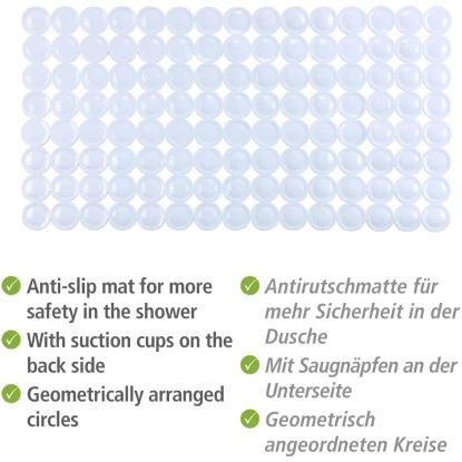 Für mehr Sicherheit und Komfort in der Badewanne sorgt die praktische Wenko Wanneneinlage Belem 67,5 cm x 36 cm in Weiß. Die rechteckige Wanneneinlage zeichnet eine Kombination aus ansprechender Optik und funktionaler Beschaffenheit aus, auf diese Weise verleiht sie Ihrer Wanne auf elegante Art den letzten Schliff. Das Design der Antirutschmatte überzeugt dank geometrisch angeordneten Kreisen, die ein in sich stimmiges Bild ergeben. In klassischem Weiß gehalten, fügt sich die Einlage bestens in Ihr bestehendes Badezimmer-Interior ein. Die dekorative Matte in 67,5 cm x 36 cm verfügt über eine hautsympathische, angenehme Oberfläche mit Rutschstopp-Struktur, welche zuverlässig das Ausrutschen in der Badewanne verhindert und für einen sicheren Stand sorgt. Die Sicherheitseinlage aus hochwertig verarbeitetem Kunststoff eignet sich für gängige Badewannen. Die Oberfläche moderner Sanitärkeramik ist hart und glatt, in Verbindung mit Wasser und Seife kann sie sich daher schnell in eine gefährliche Rutschbahn verwandeln. Dem wirkt die schicke Anti-Rutschmatte entgegen: Die Saugnäpfe an der Unterseite bieten Haftung und verhindern das Verrutschen. Wichtig hierbei ist, dass der Untergrund eben, sauber und fettfrei ist. Für einen sicheren Einsatz, die Saugnäpfe vor Gebrauch fest andrücken.
